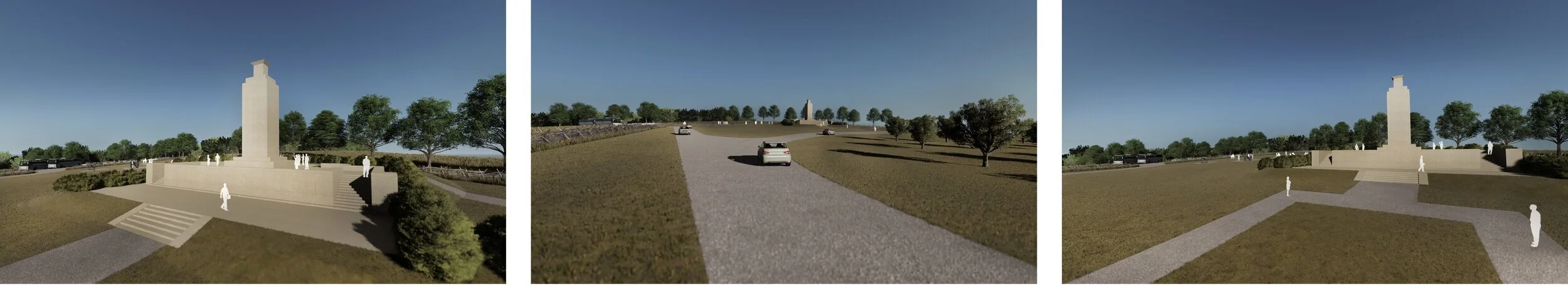 The current vehicular circulation and parking lot for the Eternal Light Peace Memorial are located directly in front of the memorial site, with both personal vehicles and buses cutting across the front of the memorial. In an effort to mitigate the distractions from the noise of traffic, parking, and bus boarding at the front of the memoral, one possibility that is included in the report recommends the addition of a new parking lot either to the west (side) or north (rear) of the memorial. As part of the proposal to relocate both these circulation patterns and parking lot, two simulations were included to guide future decisions and stewardship of the site by illustrating the potential impact of a parking lot relocation with ADA access to either the west or north of the memorial site on visitor experience. In addition, cultural landscape restoration interventions included the addition of a partial replanting of the historic Forney orchard and evergreen shrubs around the memorial.