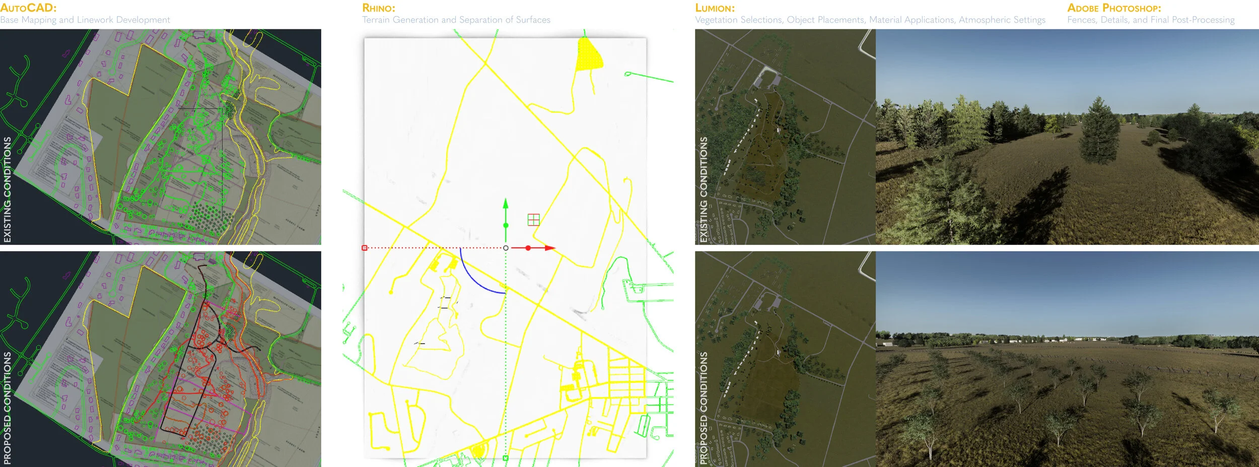 Unique terrains were created using contour information for both models and layers from the CAD files were used in creating building volume meshes from building footprints, tree addition and removal guides, and terrain splitting guides for later material applications and model placements in Lumion. Models were finalized in Lumion where additional scene set ups and atmospheric effects for rendering were completed. Final processing was accomplished in Adobe Photoshop.