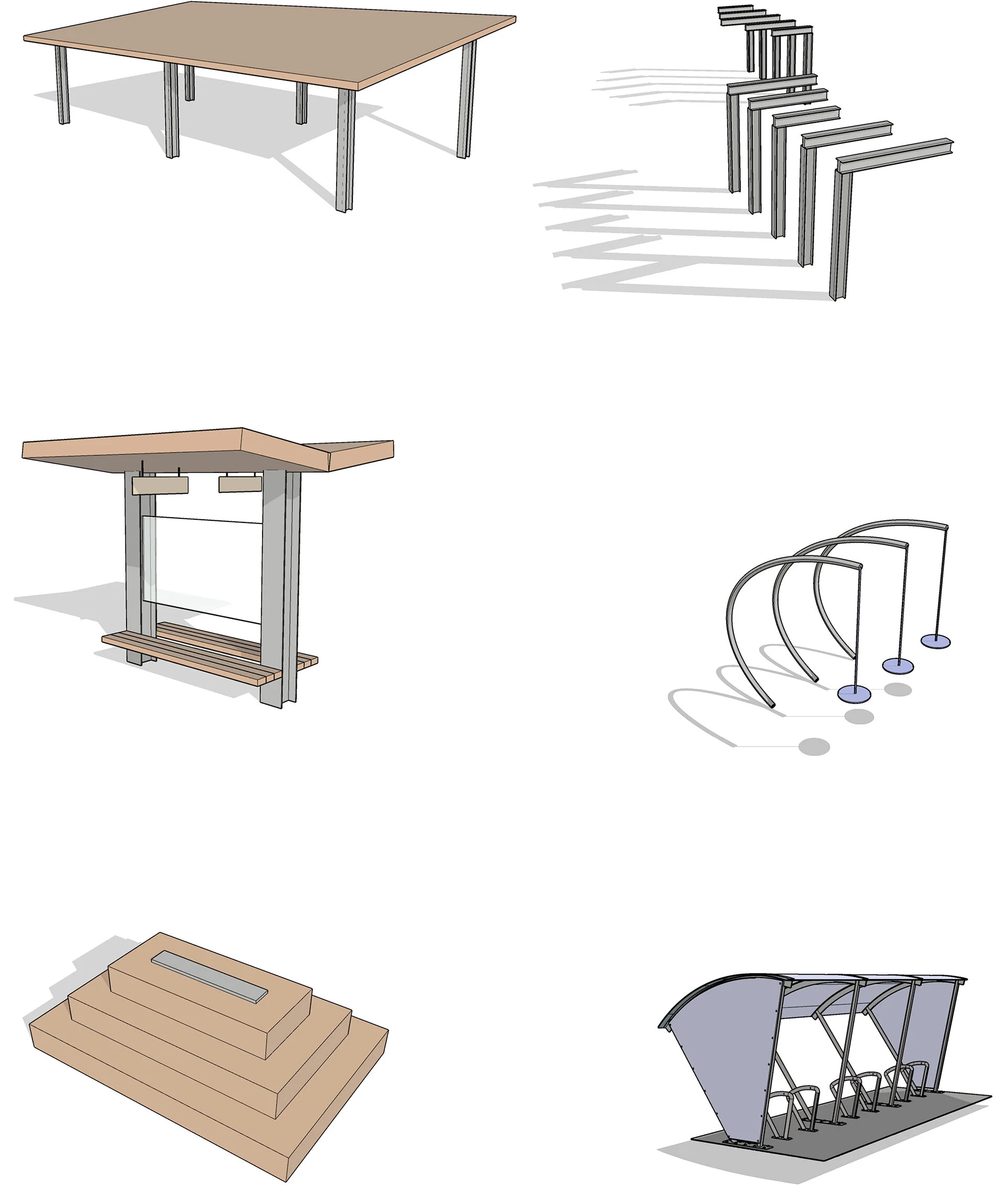 A number of structures were included in the trail’s schematic design, including (1) large solar pavilions, (2) informational rest stations, (3) tiered seating benches, (4) vertical I-beam ivy trellises, (5) swings, to be used at selected larger open programmed spaces, and (6) covered bike racks. The structures complement the goals of the corridor’s design to provide for restful recreation, active travel, opportunities for scenic overlooks, and interaction with the local environment, ecology, and community areas.